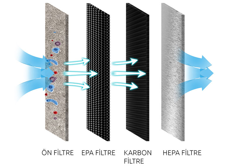 Aşamalı filtrelemeden sonra ürün zararlı gaz salmaz PM 2.5 ve diğer tehlikeli bileşenleri ayrıca filtreler.