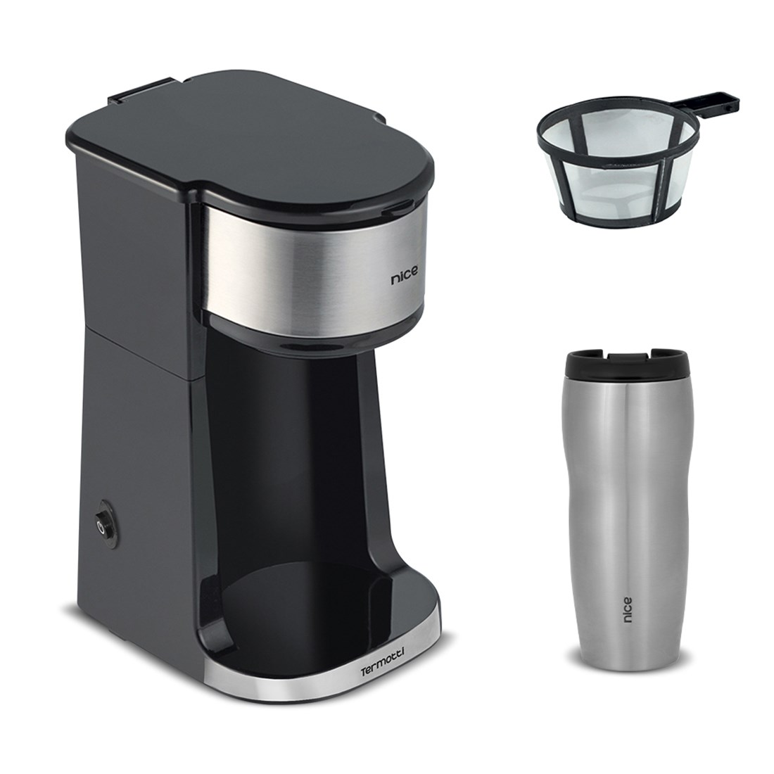 Nice Çelik Sızdırmaz Termoslu Filtre Kahve Makinesi Termotti Siyah Gövde – Inox Termos Bardak 750W Performans. Take&Away sızdırmaz termos bardak. 450 ml su haznesi. Kolay temizlenebilir ve yıkanabilir filtre. 4 dakikada hızlı kahve. Susuz çalışma koruması. Güvenli başlatma butonu. Paslanmaz çelik termos bardak. Termos bardak ile 4 saat sıcak tutma. Termos bardak ile 6 saat soğuk tutma.