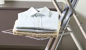 Ütü desteği, çamaşır rafı ve kablo tutucu sayesinde ütüleme sırasında her şey düzenli olacaktır: Çalışma yüzeyinin yanındaki kazan, çalışma yüzeyinin altında ütülenen giysiler ve aradan buhar kablosu çıkar.
