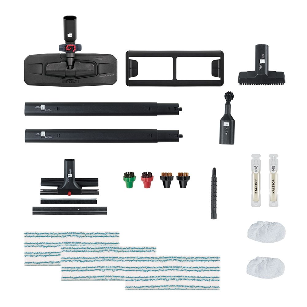 Pakete 15 adet aksesuar dahildir: 3 adet yer bezi, 2 adet sünger başlığı ve zemin, halı, koltuk, ayna, ocak ve banyo armatürleri gibi tüm yüzeylerin temizliği için 10 adet aksesuar.